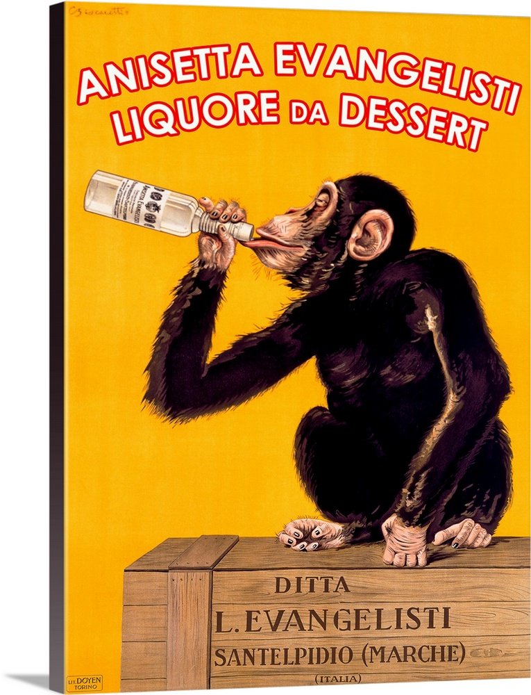 Antique poster print of a monkey sitting on top of a wooden crate drinking a bottle of liquor.