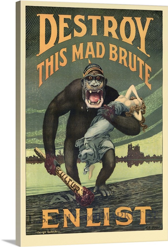 Vintage World War I recruiting poster featuring a giant gorilla wearing a helmet labeled Militarism, holding a blood stained club labeled Kultur, and a terrified woman. It reads, Destroy This Mad Brute – Enlist.