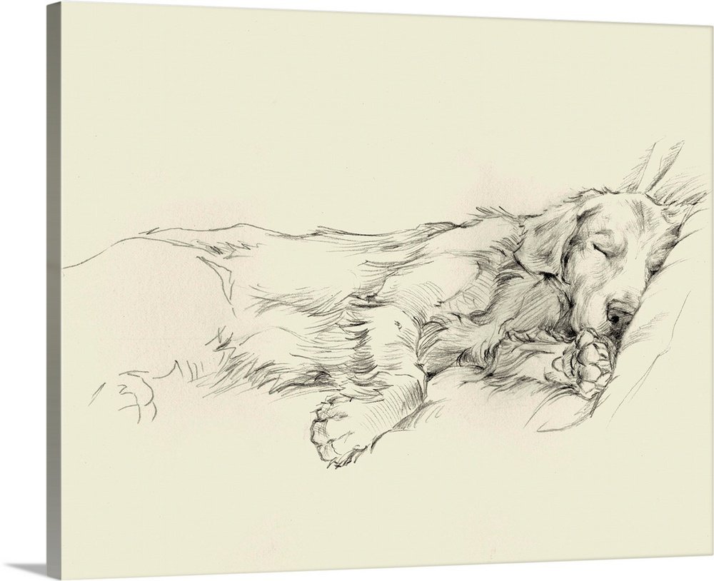 Pencil drawing of a dog sleeping deeply on a couch.