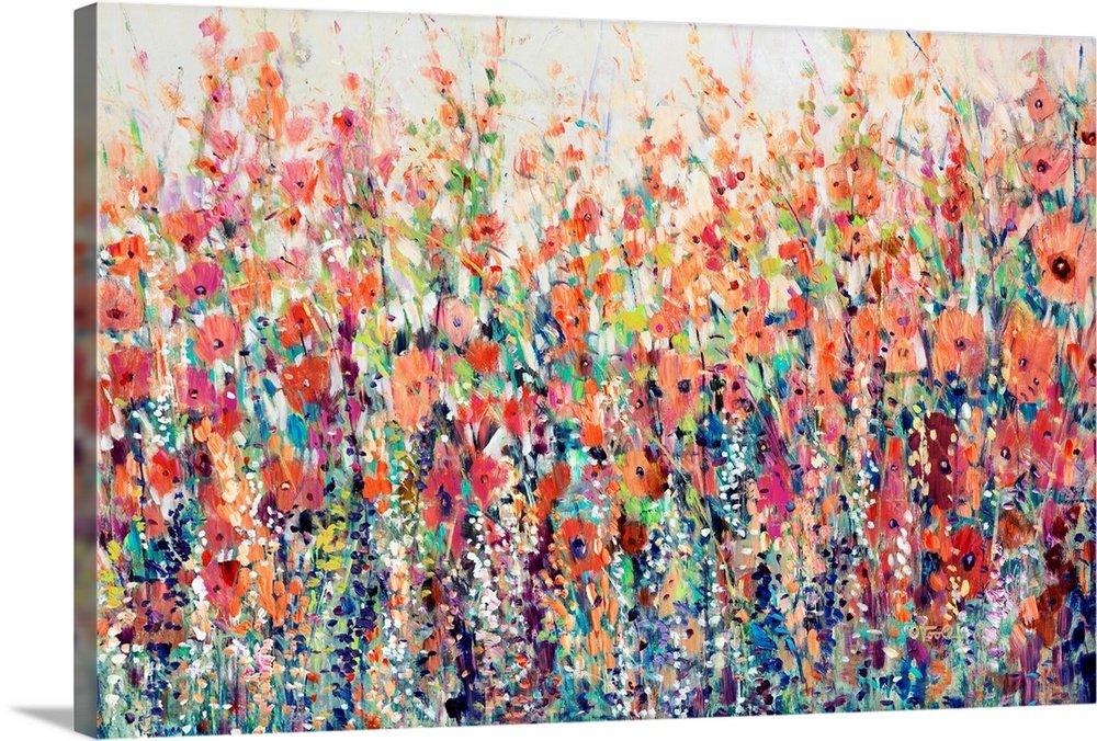 A riot of tall, poppy-like wildflowers and grasses in a blend of warm, light red and orange tones. It’s casual impressionist style evokes warm summer days and would bring cheer to any room.