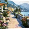 This large painting has fruit baskets and flower pots sitting on a window sill that looks out over a garden.