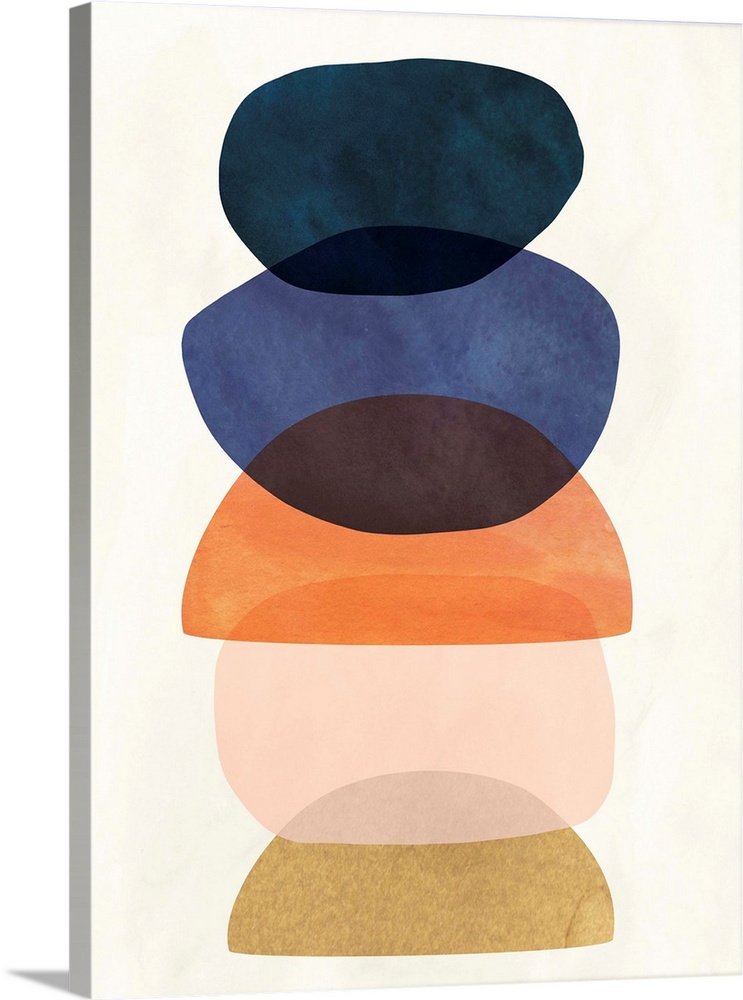Mid-century modern style abstract painting with multi-colored overlapping shapes.