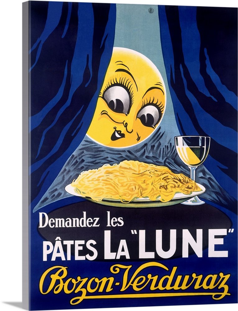 A large vintage poster of a yellow moon peering through curtains at a plate of spaghetti and wine glass.