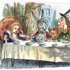 Portrait, vintage advertisement for Prunier with French text surrounding an illustration of a person with a basket on his head walking out of the water, with a large fish in one arm and a large steaming clam in the other.