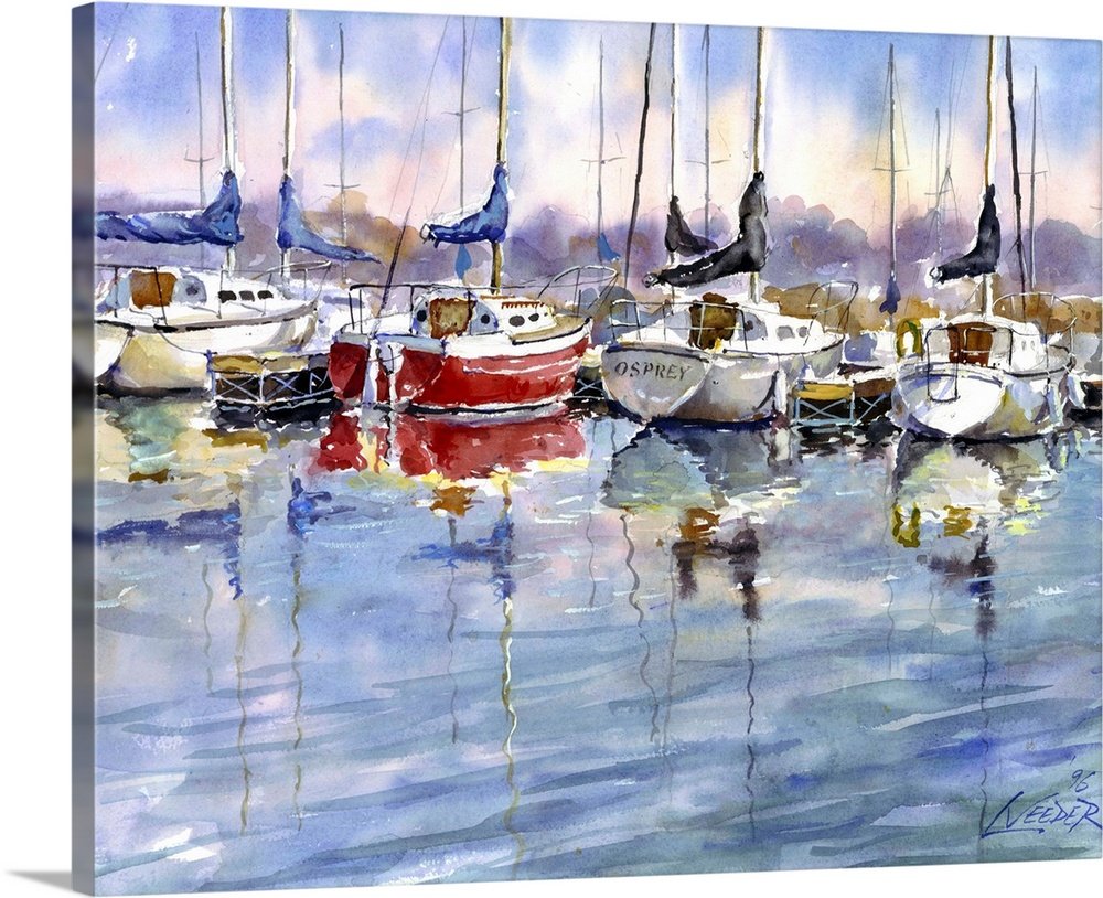 Contemporary piece using water colors to paint sail boats that sit docked at the marina.