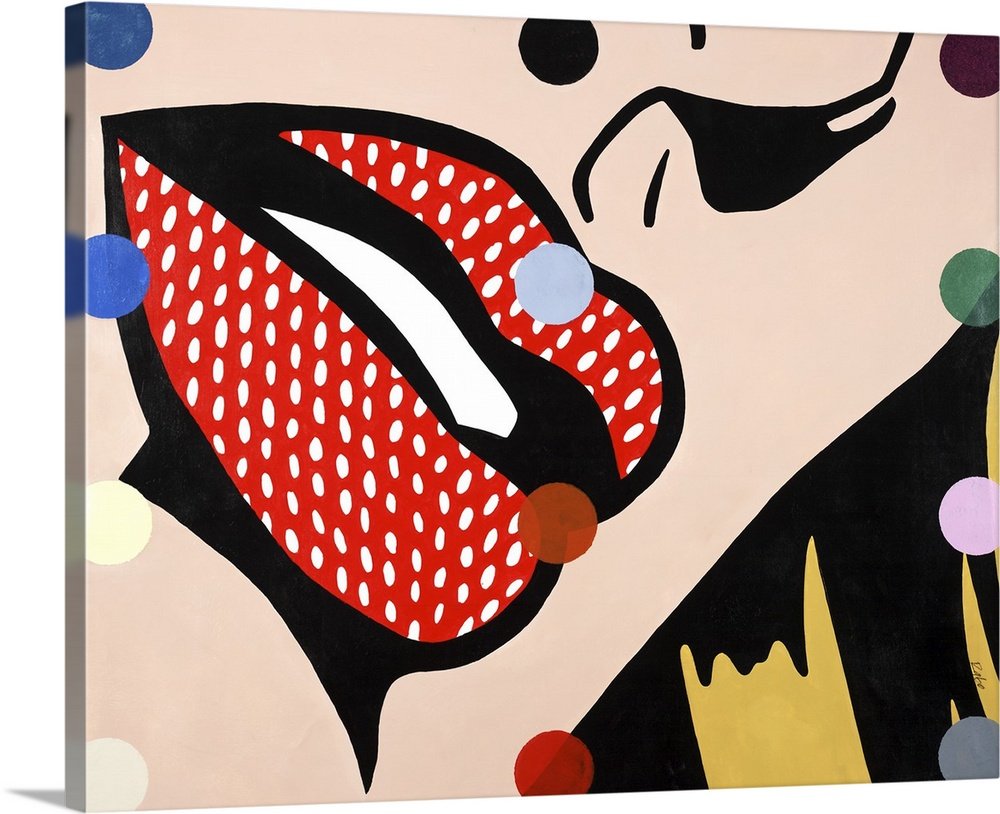 Pop art style painting with a close up of a woman’s face highlighting her red lips, with white dots on top and colorful dots in the foreground going up and down the painting in lines.