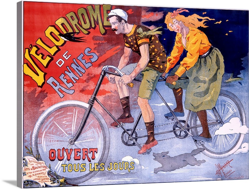 Old poster print of couple riding on tandem bike down dark street at night.